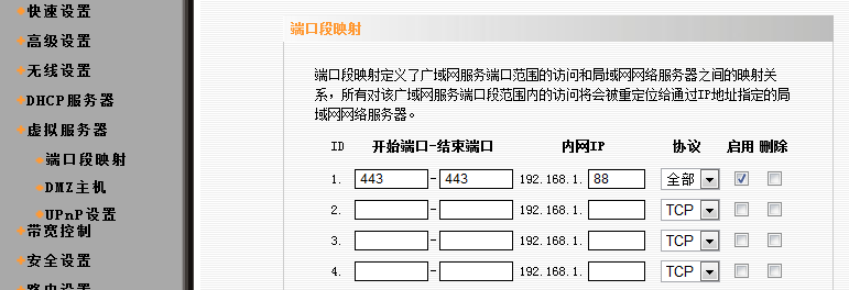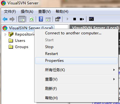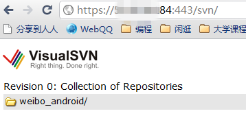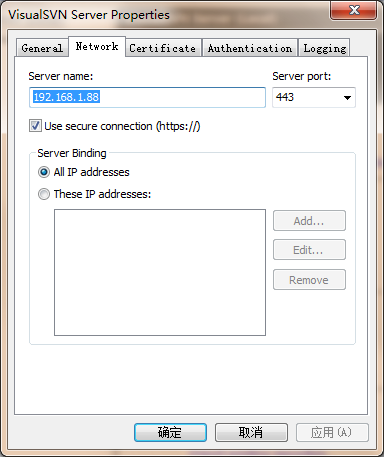 外网连接VisualSVN的配置 Posted on 2011-06-18 | Comments: 0 | Views: 311 项目需要搭建svn服务器,组员不在一个局域网,于是尝试用VisualSVN在一台笔记本搭建配置管理环境,然后外网的组员也能访问。 右键单击VisualSVN Server(local),选择Properties: 选择Network,在server name里填写服务器在局域网的地址,192.168.1.88是这台笔记本服务器的局域网内网地址: 外网访问还要修改端口映射,在路由器设置里映射端口: 然后外网的组员输入笔记本服务器的公网地址就可以访问了: